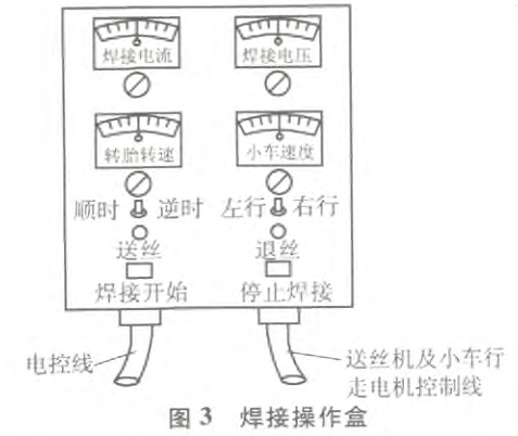 (1)在焊接操作盒l(wèi)O上按下“焊接開始”按鈕,焊接開始。此時(shí)焊接小車按預(yù)先設(shè)定的焊接方向和焊接速度行走,同時(shí)轉(zhuǎn)胎5也隨之反向同步轉(zhuǎn)動(dòng)。