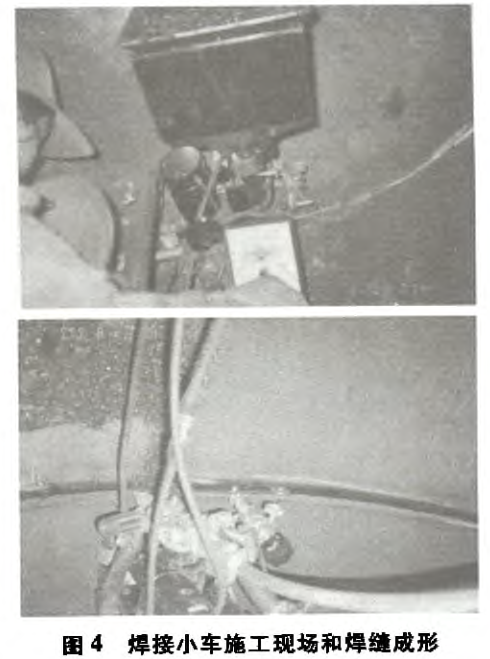 (4)焊接過程中,焊縫跟蹤器7將始終為焊接小車導(dǎo)向。在焊接臨近頭尾相接時(shí)。跟蹤輪將失去焊縫依托,但靠原已形成的導(dǎo)向作用延續(xù),焊接小車仍會(huì)沿焊接反向繼續(xù)前進(jìn)直至與焊接起點(diǎn)重合。完成焊縫對(duì)接后,按下焊接操作盒10上的“停止焊接”按鈕,內(nèi)環(huán)縫焊接結(jié)束。焊接小車施工現(xiàn)場(chǎng)和焊縫成形如圖4所示