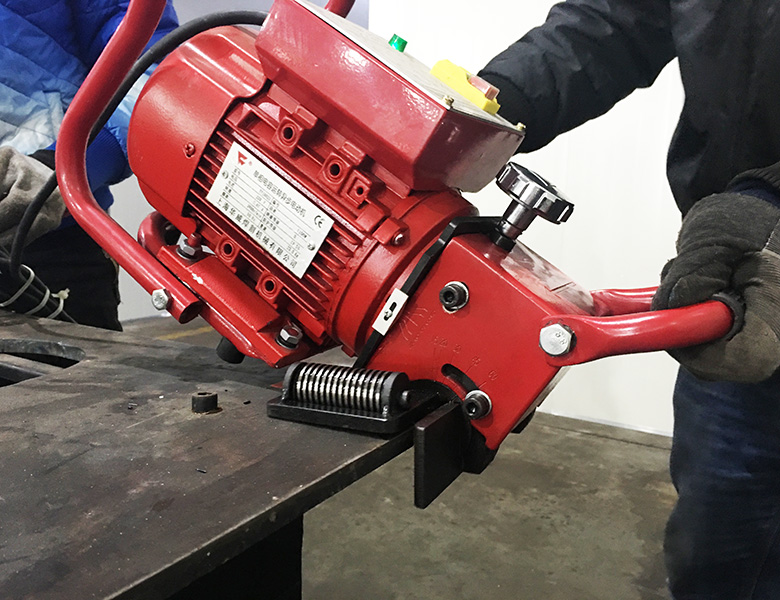 在啟動之前,請注意坡口機的放置位置,不同的位置采用不同的操作方式。如果你需要把它放于工件的邊緣,則以平行方式固定設備,使刀盤不碰觸工件(工作臺長度的2/3)。然后啟動,不斷地慢慢地引導銑刀沿箭頭指示的方向工作。