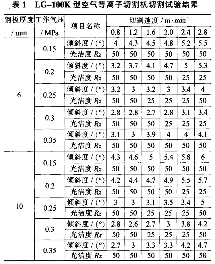 用數(shù)控等離子切割機可以切割各種形狀復雜的工件,并具有切割速度快、效率高、切割面質(zhì)量好、切割尺寸精確、工件熱變形小等優(yōu)點。切割的零件不需機械加工就可直接進行焊接和應用。但數(shù)控等離子切割機是用等離子弧進行切割,它與氧氣切割相比.仍有一定的缺陷,主要體現(xiàn)在切割面的傾斜度較大,光潔度沒有氧氣切割的好。評定數(shù)控等離子切割質(zhì)量好壞的主要判據(jù)是:切割面的傾斜度、切縫的割紋深度、掛渣多少等。一個優(yōu)質(zhì)的切割面其傾斜度應在30以下,割紋深度應在O.15 mm以下,且掛渣少,容易清除。在電壓、電流穩(wěn)定的條件下,影響切割質(zhì)量的因素除了電極、噴嘴本身質(zhì)量以外,主要還有二個方面的原因:一是割嘴高度與穩(wěn)定;二是切割速度與工作氣壓的匹配。割嘴離鋼板的高度當采用弧壓調(diào)高器來控制時,因其動態(tài)定位精度可達±0.013姍,所以能保證割嘴與鋼板的高度保持不變,故切割面的傾斜度小而均勻,且光潔度好。當用手工來調(diào)節(jié)割嘴離鋼板的高度時。被切鋼板要盡量放平,以減少割炬的調(diào)節(jié)次數(shù)。保證割炬切割過程中的穩(wěn)定。本文采用手工調(diào)節(jié)方式,將割嘴離鋼板的高度控制在6~8 mm,通過一系列的切割試驗,闡述了切割速度(穢)、工作氣壓(P)與切割質(zhì)量的關(guān)系。