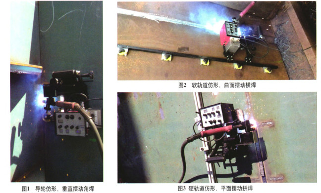根據客戶要求及我們對船廠現場的實地考察,作出了如下改進:(1)一機多用要實現客戶的一機多用要求,需對設備的自重、吸附力及仿形能力作相應的設計改進。第一,對設備行走模塊進行了重新設計以減輕自重。①車體材料為壓鑄鋁合金,結構上采用薄壁加強肋設計,模具化生產,輕便耐用。⑦車體重心重新進行了優化布局,減少外力力矩。第二,吸附裝置采用了永磁吸附方式。①選用高性能永磁材料。②采用軟磁磁軛,使高性能磁體工作于最大磁能積工作點,減少吸附裝置自重的同時極大地提升設備的吸附力。第三,采用導輪結合軟、硬軌道的綜合仿形方式。使設備能很好地適應平直及帶曲率焊道的焊接。具體焊接實現如圖l一圖3所示。(2)整機4 000h的使用壽命 設備各模塊中對壽命影響最大的是焊接擺動器,而我公司常規的擺動功能模塊主要有:①基于有刷電動機的焊接擺動器。其特點是控制線路簡單、價格便宜,但其存在控制精度低且壽命短,額定使用壽命只有2 000h,期間需更換擺動電動機以延長使用壽命。②基于BLDC電動機的焊接擺動器。其特點是控制線路較復雜、控制精度較高、使用壽命長(理論壽命可達10 000h以上),但其存在無法實現運動的絕對坐標控制。③基于伺服電動機的焊接擺動器。其特點是使用.廳命長、控制flj度j;‘j兒¨J‘吱現運動的絕對坐標控制,但其存在價格高昂、控制線路復雜的缺點。綜合考慮效率質量、弱化焊工技能的要求,且本案例中不需進行運動的絕對坐標控制,決定選用基于B LDC電動機的鐘擺焊接擺動器模塊。